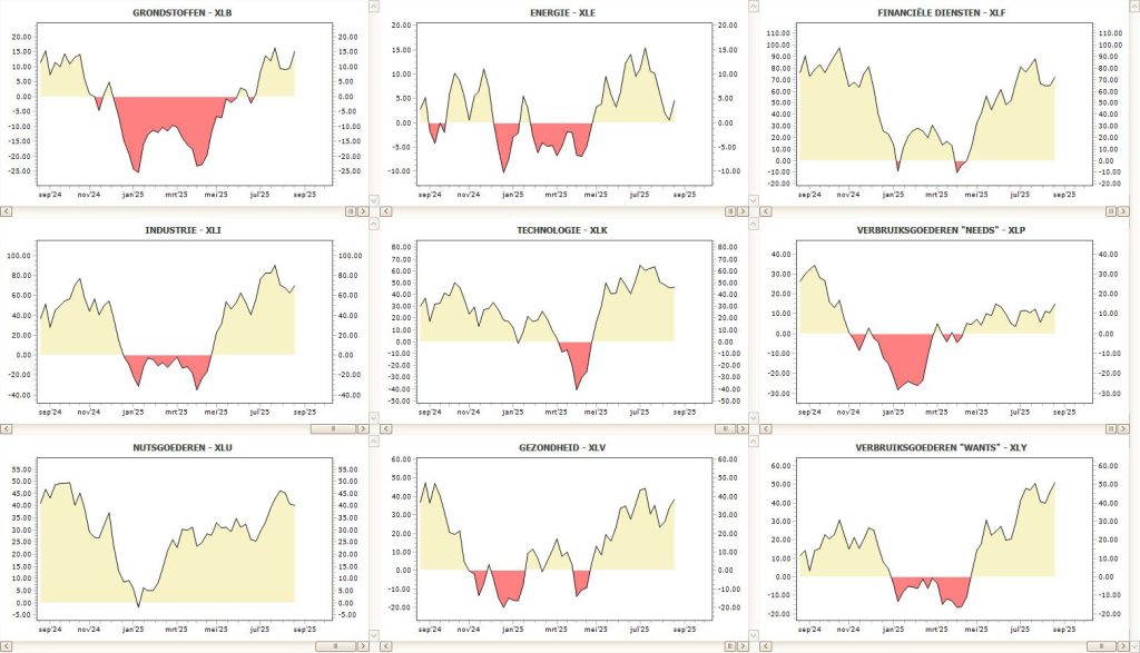 - Leiders: sectoren met stijgende RS lopen voorop; sectorrotatie helpt de volgorde te lezen.
