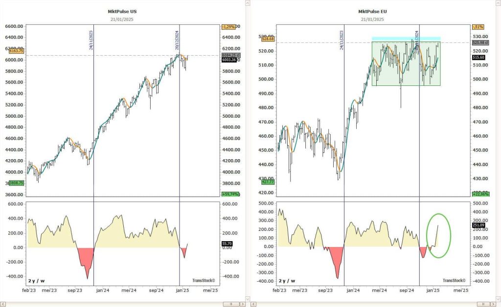 - Vergelijk met Amerika: daar verlaat de MarketPulse net de rode zone. Europa oogt technisch veelbelovend en een uitbraak naar een all-time high ligt binnen handbereik.