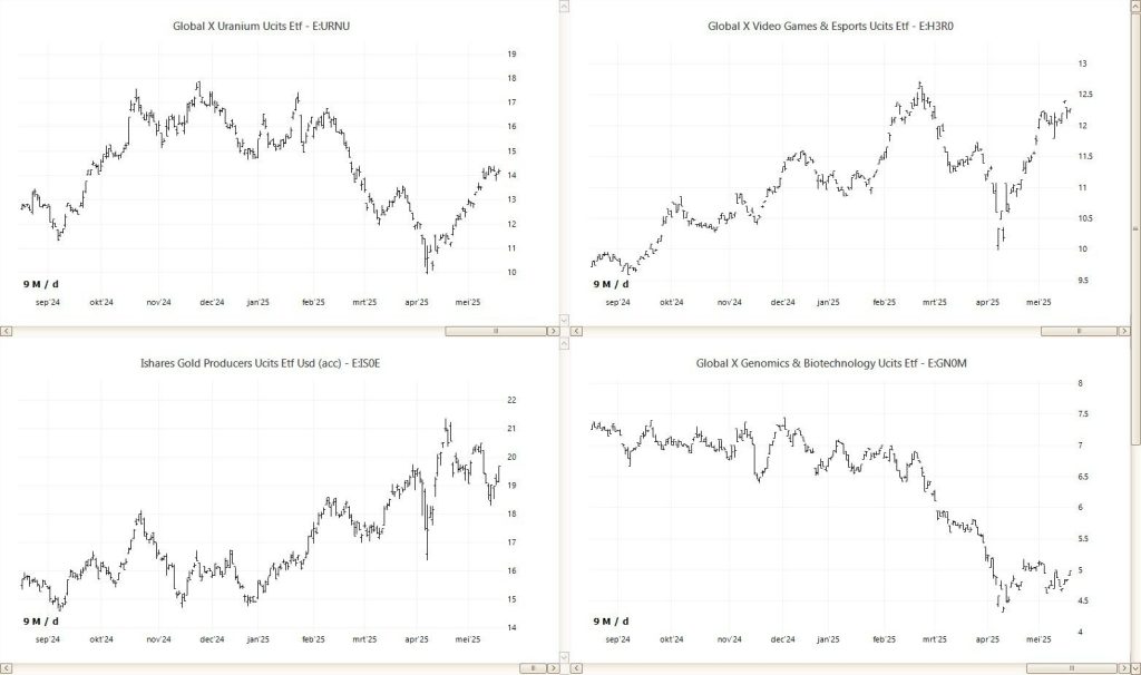 • URNU (Uranium)Een schoolvoorbeeld van herstel. Na een scherpe terugval in maart-april veert de koers krachtig op. De beweging van april-mei past binnen het profiel van een ETF met aantrekkend momentum. De koers doorbreekt eerdere weerstand rond €13, wat het opwaartse potentieel bevestigt.