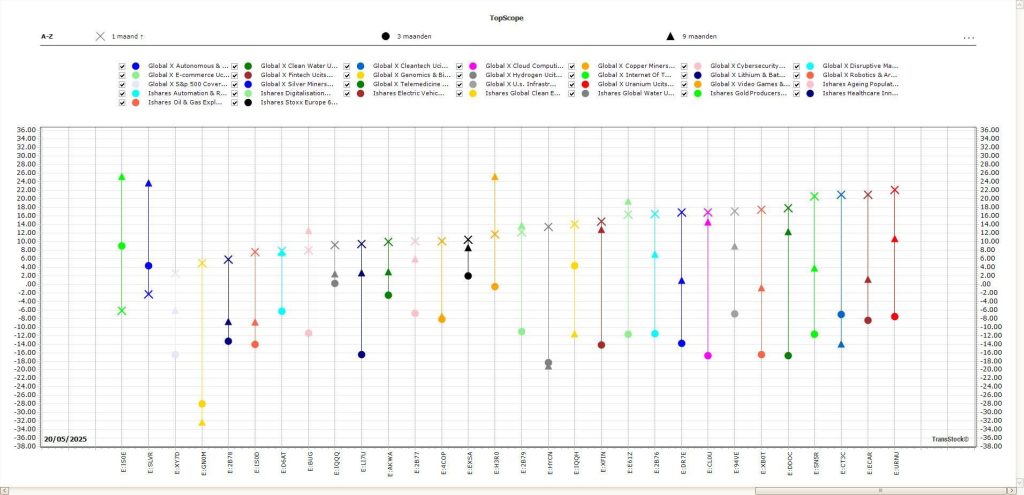 Op 1 maand springen eruit: URNU (Uranium) +22,14%, ECAR (Electric Vehicles) +20,95%, CT3C (Cleantech) +20,95%. Let op: één sterke maand volstaat niet; we toetsen breder.