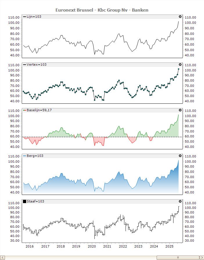 De Berggrafiek vult het gebied onder de koerslijn in, waardoor stijgingen en dalingen visueel krachtiger naar voren komen. In de grafiek van KBC valt de opmars vanaf 2023 veel sterker op door het volle vlak onder de curve. Daardoor is dit type ideaal om lange bewegingen visueel vast te zetten.