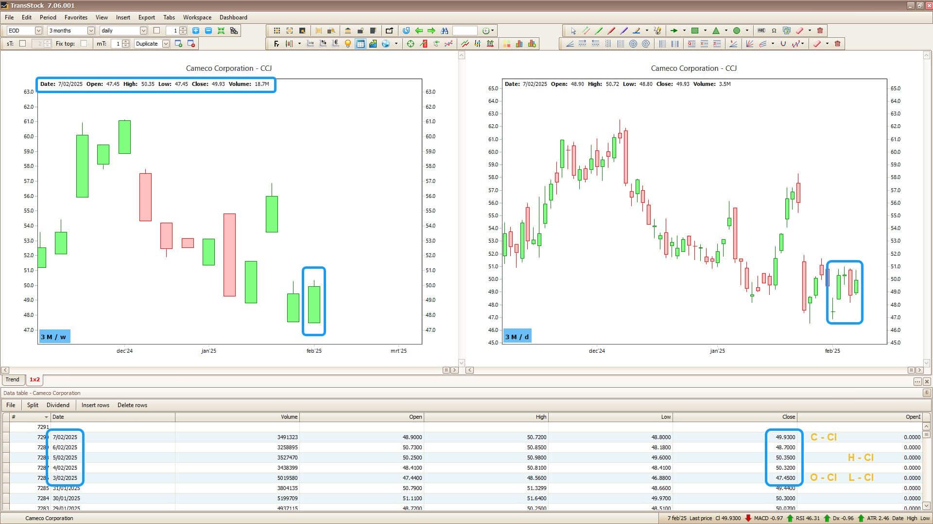 • Op week/maand (of andere aggregatie) worden vier slotkoersen gebruikt: Opening Close (eerste close), High Close (hoogste close), Low Close (laagste close) en Final Close (laatste close) binnen de periode.