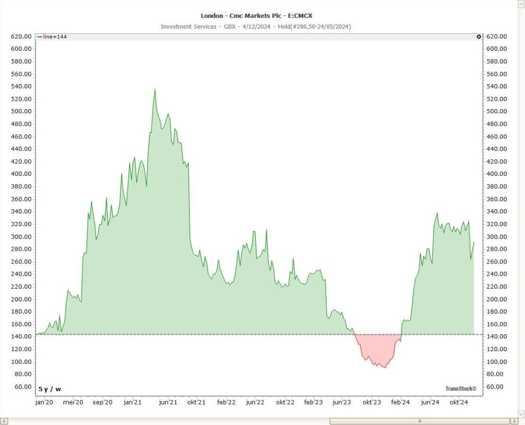 Een gevulde lijn (“bergprofiel”) die trendrichting en continuïteit helder toont — prettig leesbaar voor langere periodes of rustige opwaartse trajecten.