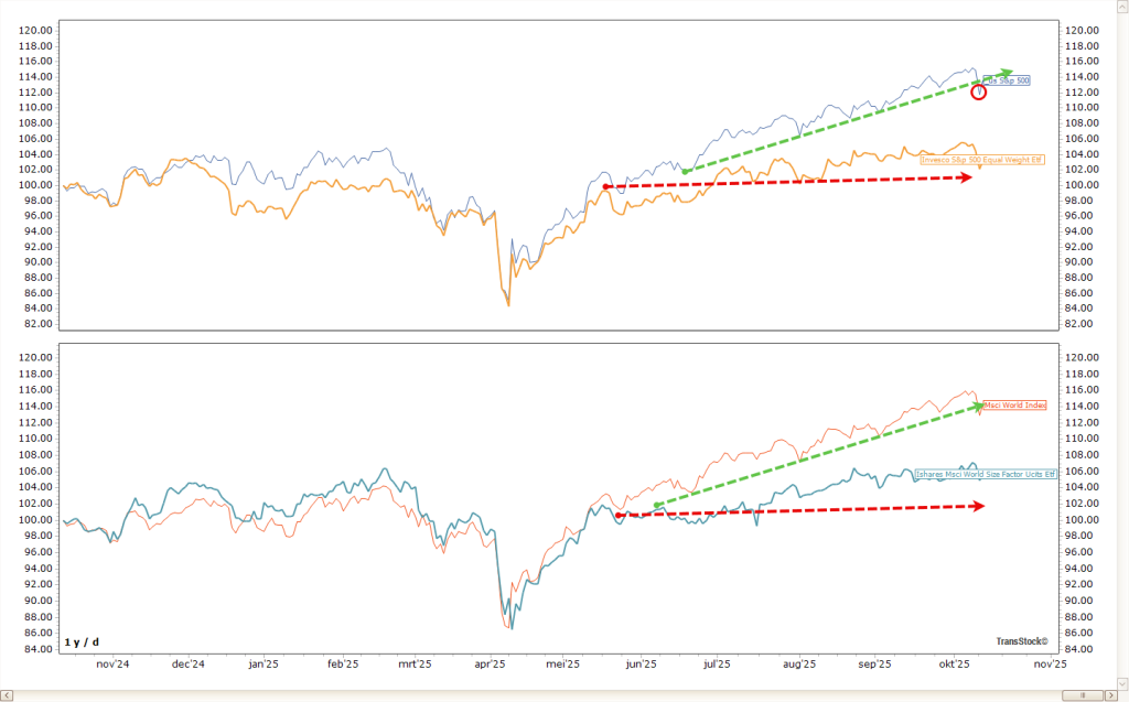 De grafiek hierboven toont hoe de standaard S&P 500 (blauw) stevig blijft stijgen, terwijl de Equal Weight-index (oranje) sinds de zomer nauwelijks vooruitgaat.
