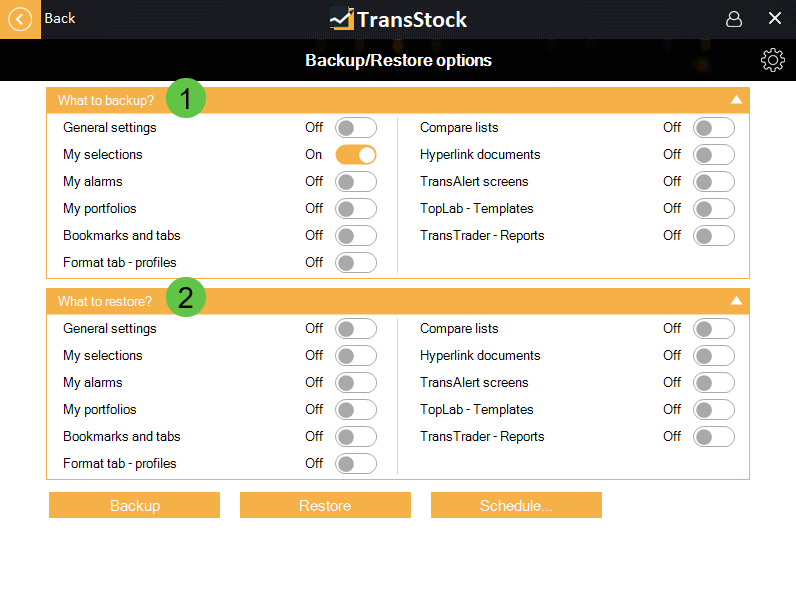 3. Kies het icoon Backup. En selecteer de items die u wenst: profielen, eigen lijsten, templates.