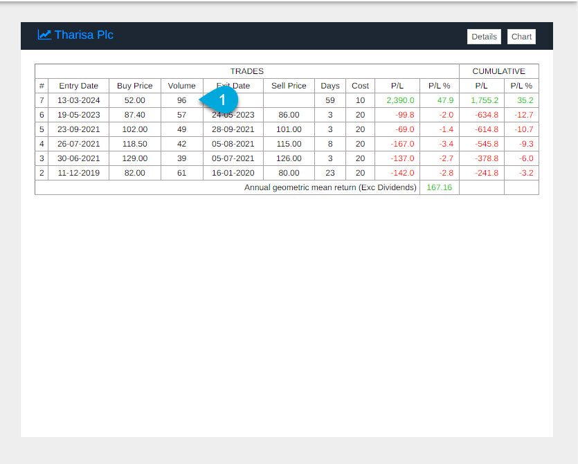 Overzicht van alle historische transacties, inclusief winst of verlies, cumulatieven en het geometrisch jaarrendement. Let wel op: bij het Beursgrafiek Countertrend model gelden vaak striktere stop-loss regels, zowel in prijs als in tijd.