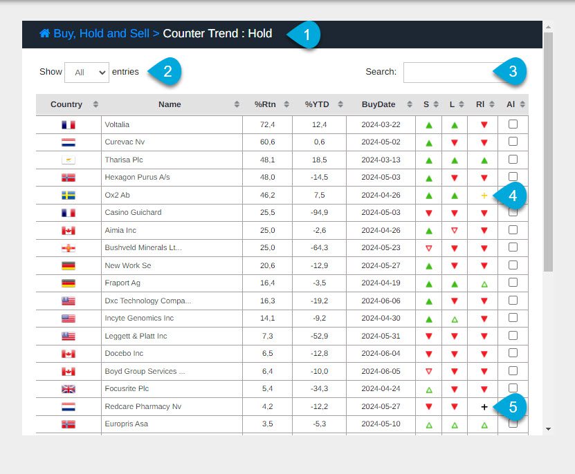 Vink Counter Trades aan om de signalen te tonen. Aandelen met stijgende kracht schuiven vaak door naar Trend Buy en vervolgens Trend Hold. Zo ziet u duidelijk de overgang van een kortetermijn Countertrend signaal naar een volwaardig trendadvies.